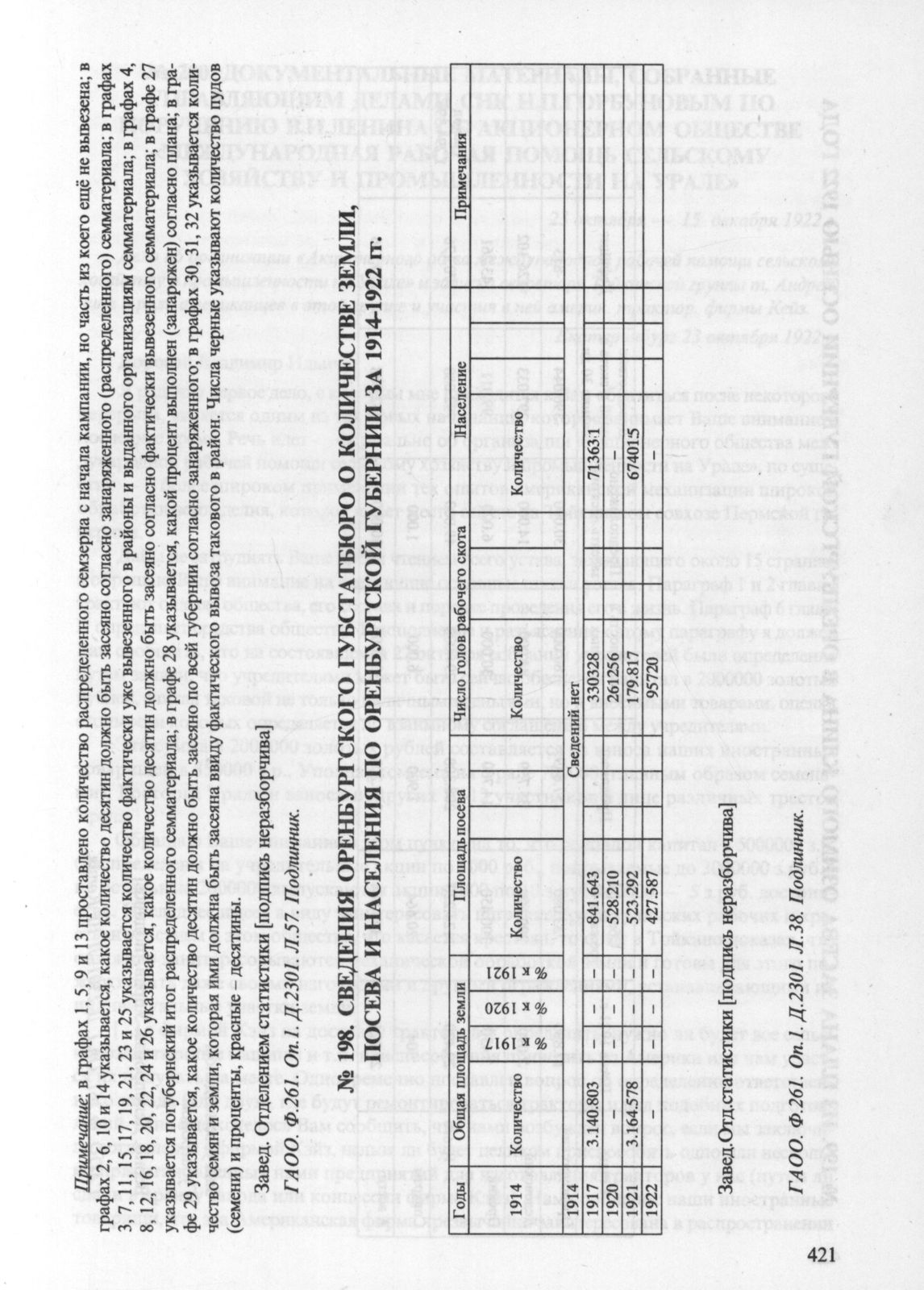 Сведения Оренбургского Губстатбюро о количестве земли, посева и населения по Оренбургской губернии за 1914-1922 гг..