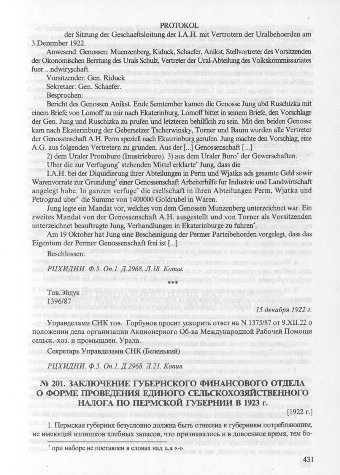 Документальные материалы, собранные Управляющим делами СНК Н.П. Горбуновым по поручению В.И. Ленина об акционерном обществе «Международная рабочая помощь сельскому хозяйству и промышленности на Урале». PROTOKOL // РЦХИДНИ. Ф.5. Оп.1. Д.2968. Л. 18. Копия.