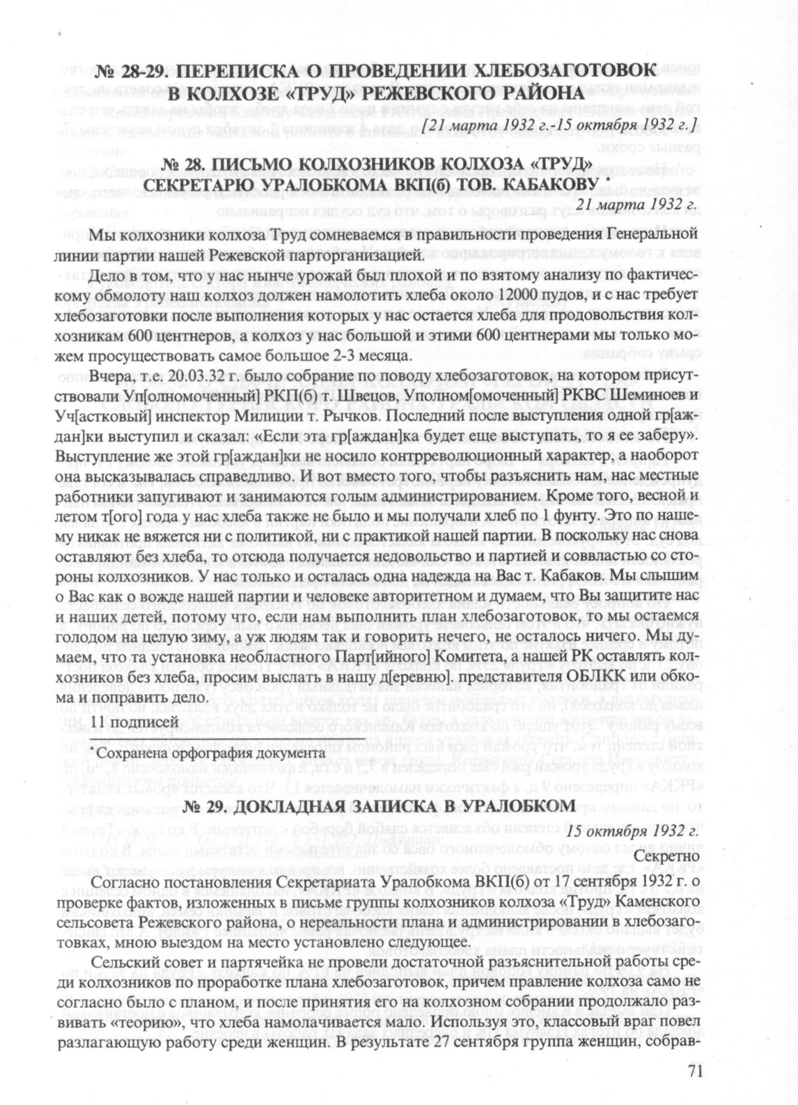 Переписка о проведении хлебозаготовок в колхозе «Труд» Ржевского района. Письмо колхозников колхоза «Труд» секретарю Уралобкома ВКП(б) тов. Кабакову, 21 марта 1932 г. // ГАСО. Ф. 88р. Оп. 1. Д. 3353. Л. 289-291. Подлинник.