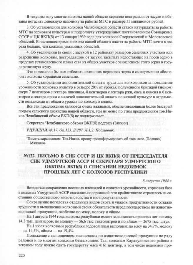 Письмо в СНК СССР и ЦК ВКП(б) от председателя СНК Удмуртской АССР и секретаря Удмуртского обкома ВКП(б) о списании недоимок прошлых лет с колхозов республики, 8 августа 1944 г. // РЦХИДНИ. Ф. 17. Оп. 123. Д. 286. Л. 3-5. Подлинник.