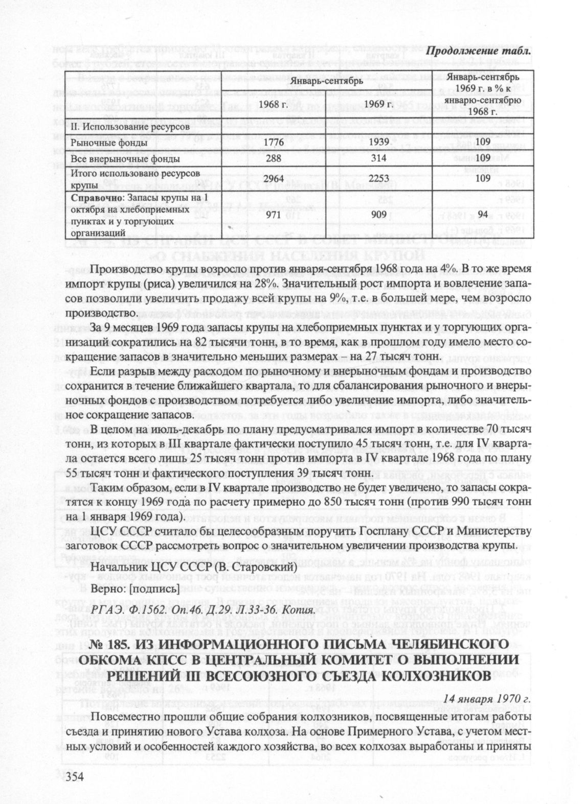 Из информационного письма Челябинского обкома КПСС в Центральный Комитет о выполнении решений III Всесоюзного Съезда колхозников, 14 января 1970 г. // ЦХСД. Ф. 5. Оп. 62. Д. 220. Л. 160-165. Подлинник.