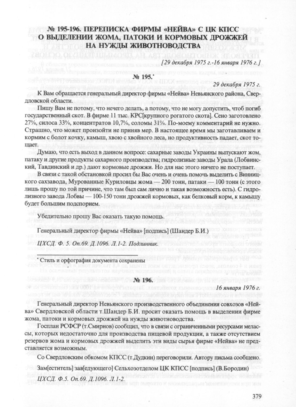 Переписка фирмы «Нейва» с ЦК КПСС о выделении жома, патоки и кормовых дрожжей на нужды животноводства, 16 января 1976 г. // ЦХСД. Ф. 5. Оп. 69. Д. 1096. Л. 1-2.