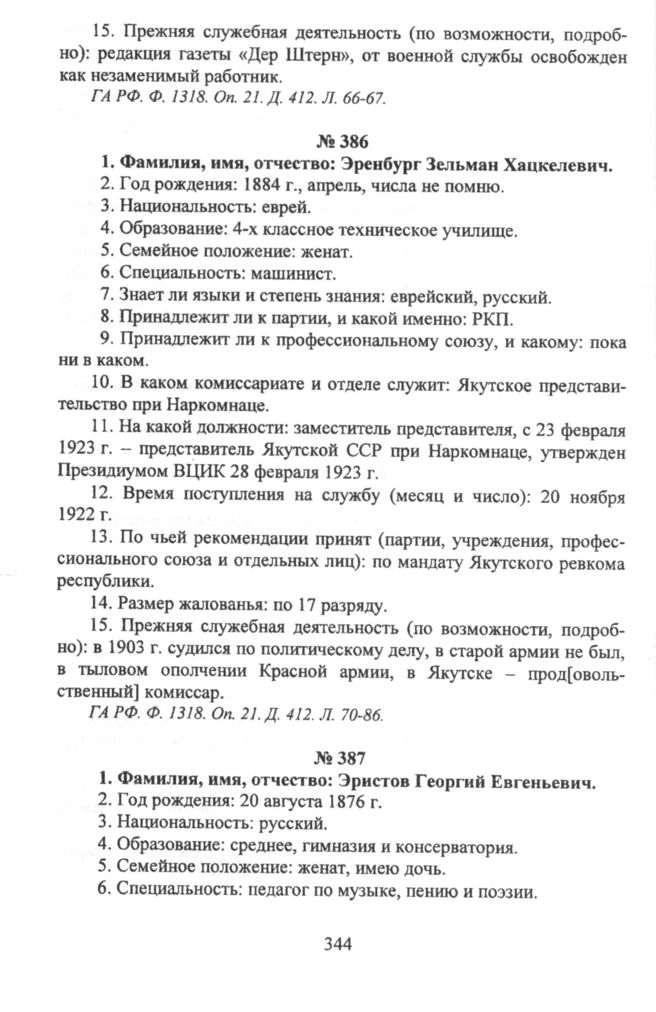 Эренбург Зельман Хацкелевич. Анкета ответственного работника Наркомнаца // ГА РФ. Ф. 1318. Oп. 21. Д. 412. Л. 70-86.