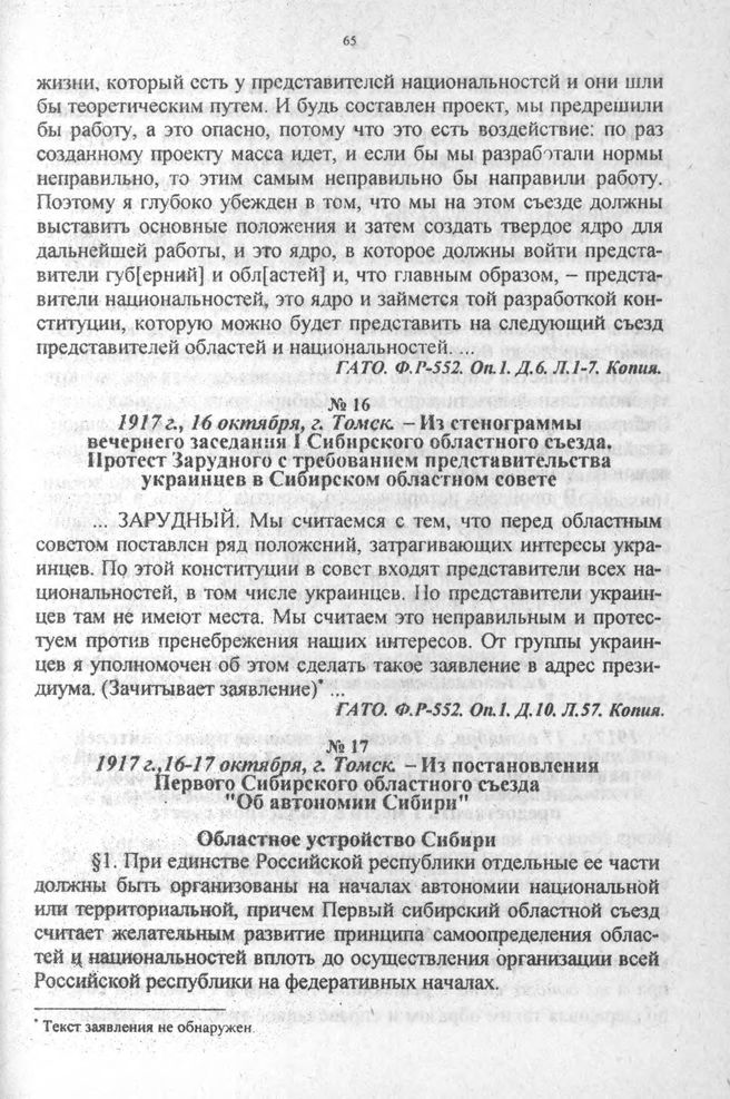 Из постановления Первого Сибирского областного съезда «Об автономии Сибири». 1917 г., 16-17 октября, г. Томск // Первый Сибирский областной съезд 8-17 октября 1917 года в г. Томске. Постановления съезда. Томск, 1917. С. 1-2.