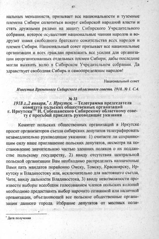 Телеграмма председателя комитета польских общественных организаций г. Иркутска И. Собещанского Сибирскому областному совету с просьбой прислать руководящие указания. 1918 г., 2 января, г. Иркутск // Известия Временного Сибирского областного совета. 1918. № 2. С. 3-4.