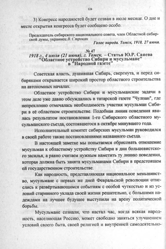 Статья Ю.Р. Саиева «Областное устройство Сибири и мусульмане» в «Народной газете». 1918 г., 4 июля (21 июня), г. Томск // Народная газета. Томск, 1918. 21 июня (4 июля).