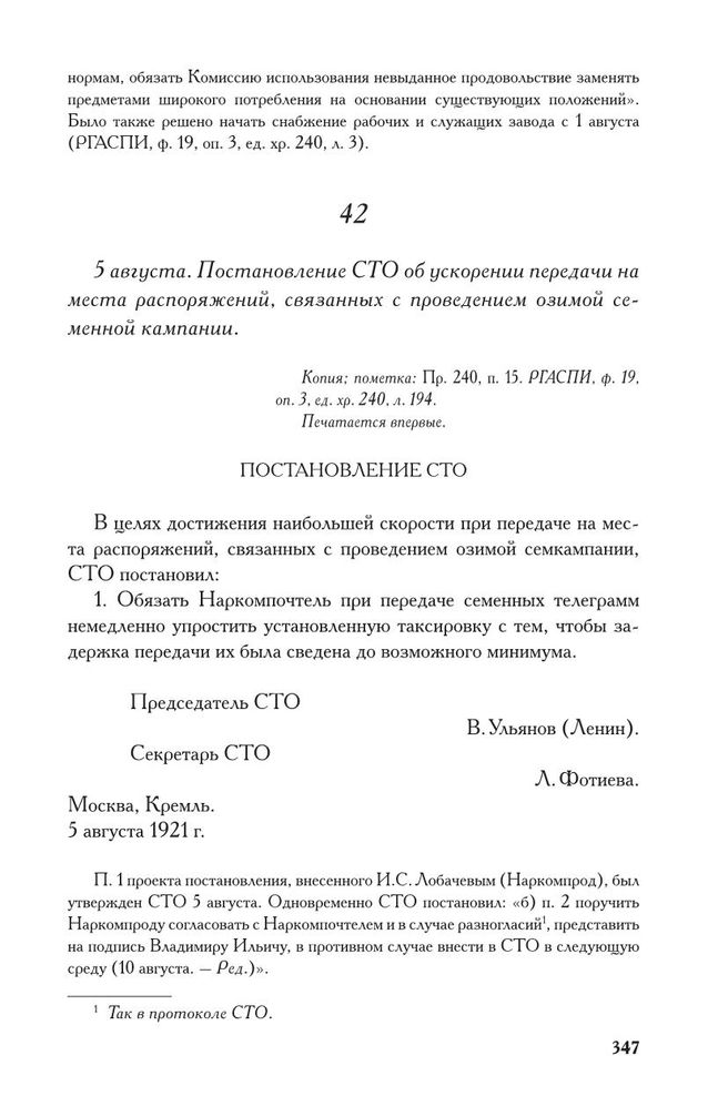 Постановление СТО об ускорении передачи на места распоряжений, связанных с проведением озимой семенной кампании. 5 августа // Копия; пометка: Пр. 240, п. 15. РГАСПИ, ф. 19, оп. 3, ед. хр. 240, л. 194. Печатается впервые.