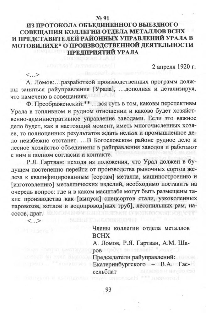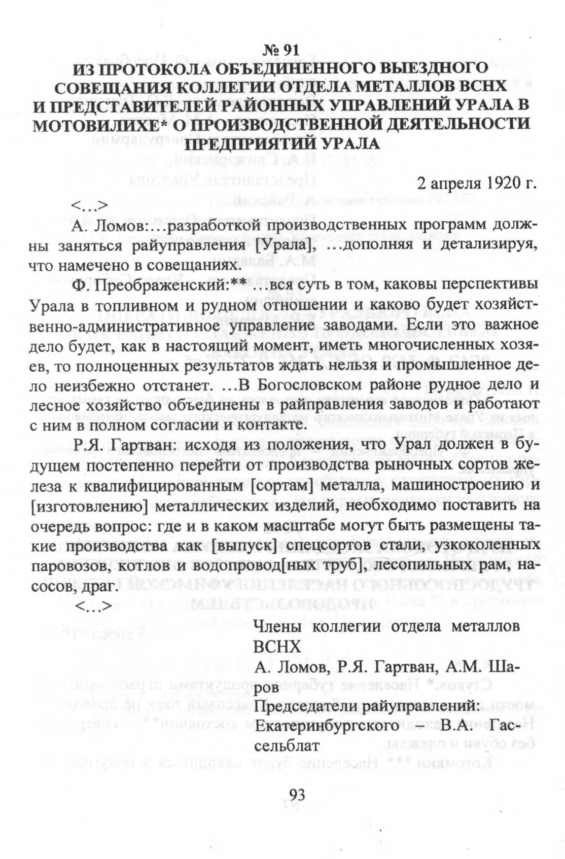 Из протокола объединенного выездного совещания коллегии отдела металлов ВСНХ и представителей районных управлений Урала в Мотовилихе о производственной деятельности предприятий Урала. 2 апреля 1920 г.