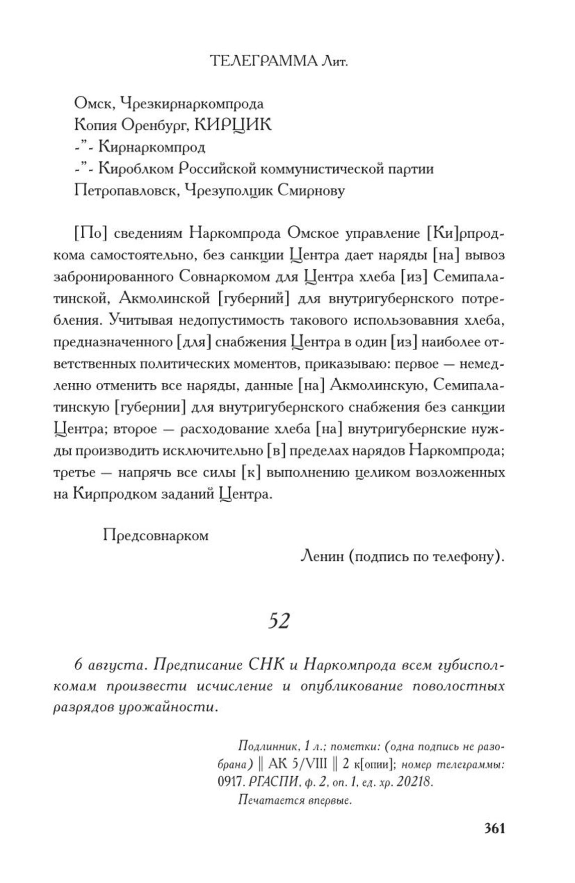 Предписание СНК и Наркомпрода всем губисполкомам произвести исчисление и опубликование поволостных разрядов урожайности. 6 августа // Подлинник, 1 л.; пометки: (одна подпись не разобрана) || АК 5/VIII || 2 к[опии]; номер телеграммы: 0917. РГАСПИ, ф. 2, оп. 1, ед. хр. 20218. Печатается впервые.