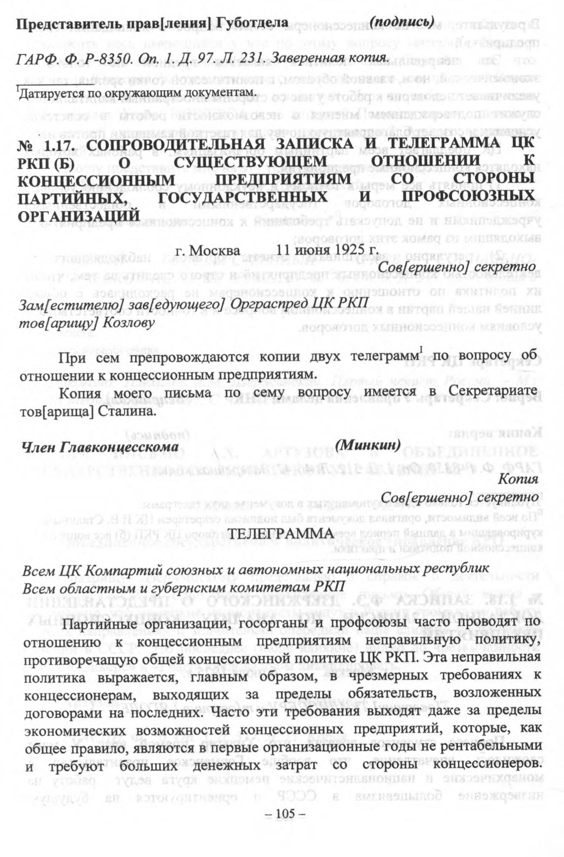 Сопроводительная записка и телеграмма ЦК РКП(б) о существующем отношении к концессионным предприятиям со стороны партийных, государственных и профсоюзных организаций. Москва, 11 июня 1925 г. // ГАРФ. Ф. P-8350. Оп. 1. Д. 312. Л. 46-47. Заверенная копия.