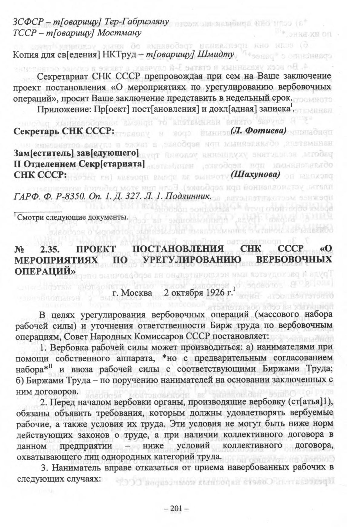 Проект постановления СНК СССР «О мероприятиях по урегулированию вербовочных операций». Москва, 2 октября 1926 г.