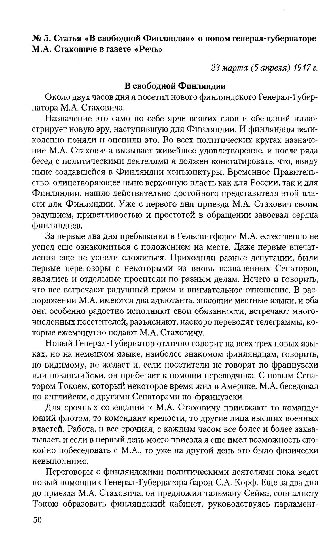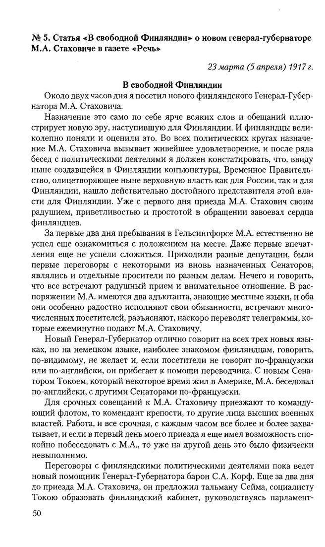 Статья «В свободной Финляндии» о новом генерал-губернаторе М.А. Стаховиче в газете «Речь». 23 марта (5 апреля) 1917 г. // Опубл.: Речь. (Пг). 1917.23 марта (5 апреля). № 70(3812). С. 3.