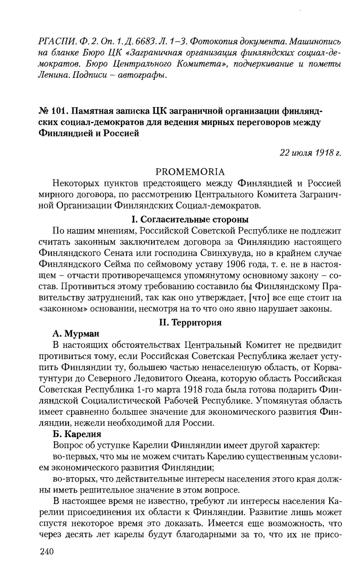 Памятная записка ЦК заграничной организации финляндских социал-демократов для ведения мирных переговоров между Финляндией и Россией. 22 июля 1918 г. // АП РФ. Ф. 3. Оп. 66. Д. 576. Л. 15-18. Машинопись на бланке Бюро ЦК «Заграничная организация финляндских социал-демократов. Бюро Центрального Комитета». Подписи - автографы.