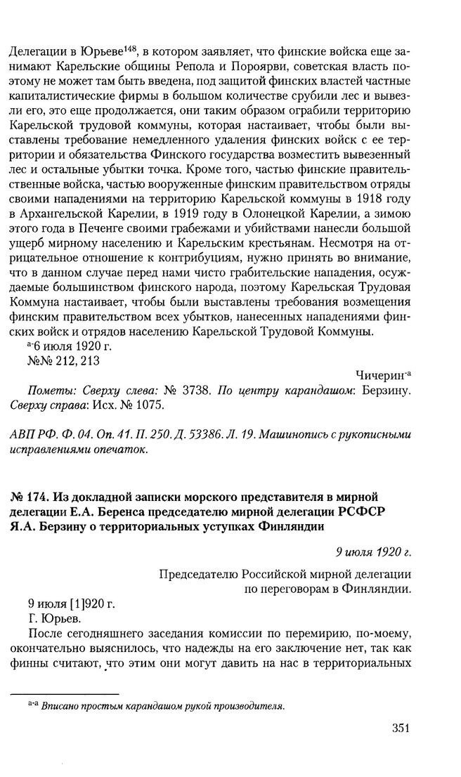 Из докладной записки морского представителя в мирной делегации Е.А. Беренса председателю мирной делегации РСФСР Я. А. Берзину о территориальных уступках Финляндии. 9 июля 1920 г. // АВП РФ. Ф. 04. Оп. 41. П. 250. Д. 53386. Л. 25-27. Машинопись (1-й экз.) на 1/ 4 листа. Подпись - автограф карандашом. Число вписано от руки.