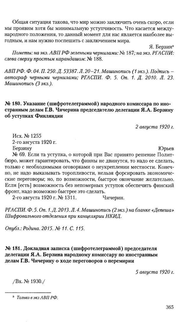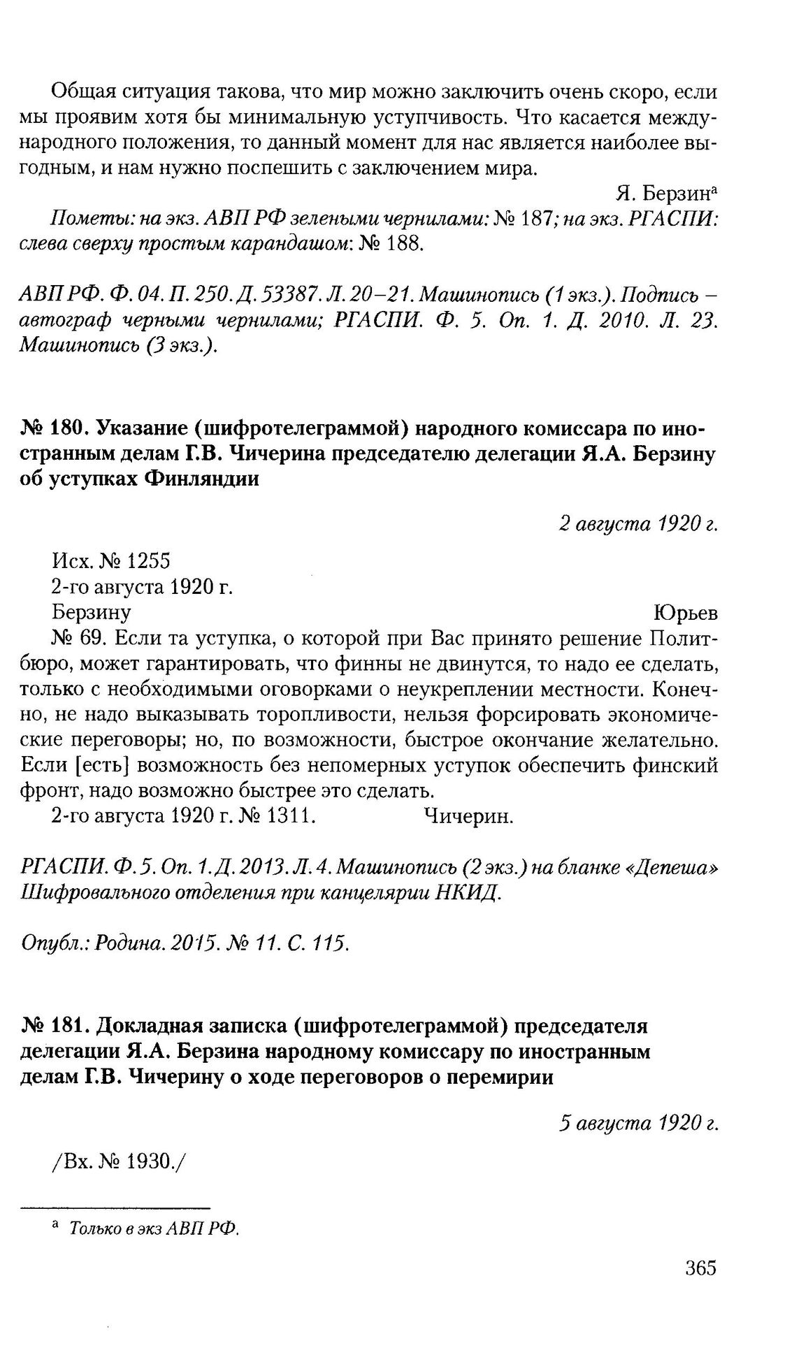 Указание (шифротелеграммой) народного комиссара по иностранным делам Г.В. Чичерина председателю делегации Я.А. Берзину об уступках Финляндии. 2 августа 1920 г. // РГАСПИ. Ф. 5. Оп. 1.Д. 2013. Л. 4. Машинопись (2экз.) на бланке «Депеша» Шифровального отделения при канцелярии НКИД. Опубл.: Родина. 2015. № 11. С. 115.