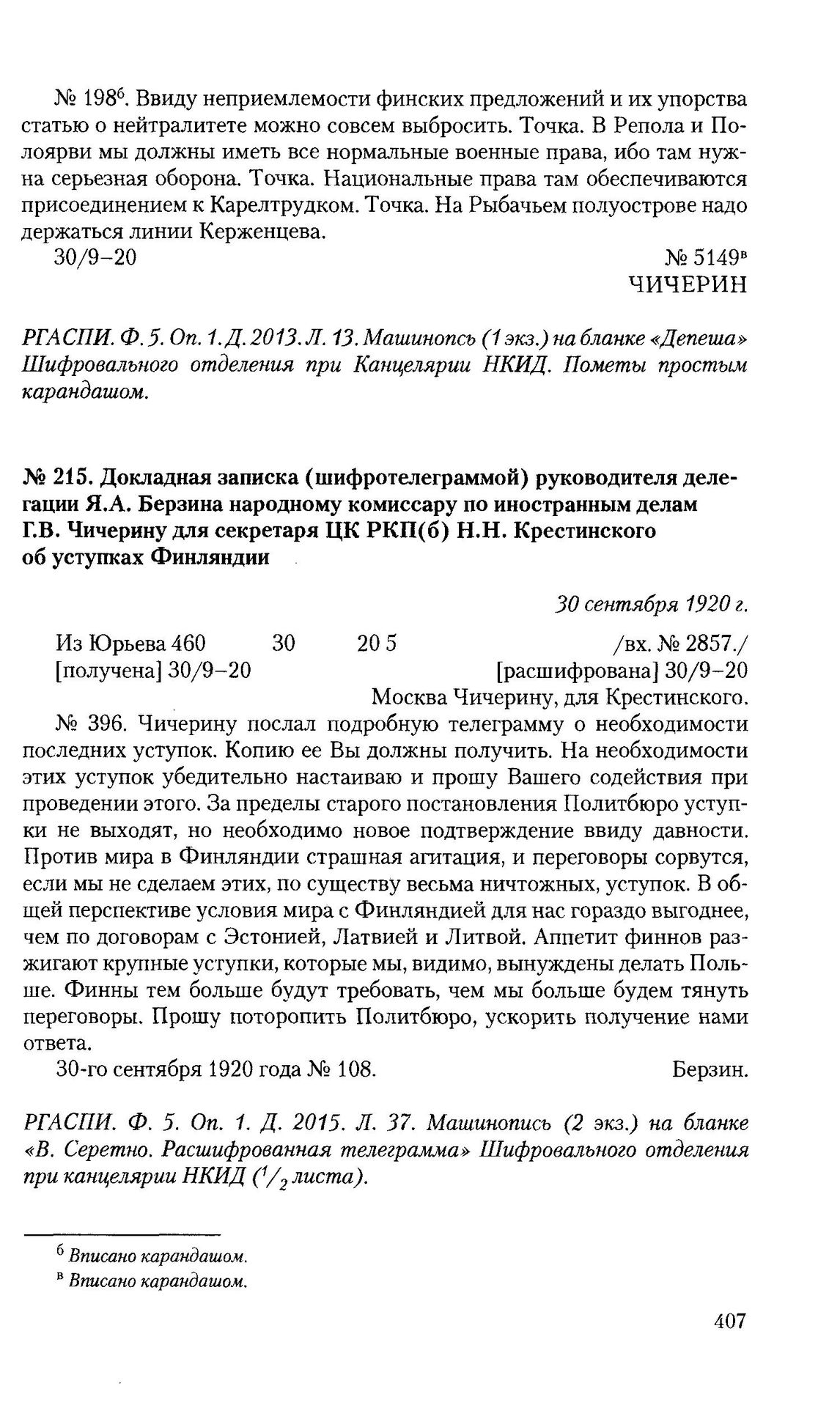 Докладная записка (шифротелеграммой) руководителя делегации Я.А. Берзина народному комиссару по иностранным делам Г.В. Чичерину для секретаря ЦК РКП(б) Н.Н. Крестинского об уступках Финляндии. 30 сентября 1920 г. // РГАСПИ. Ф. 5. Оп. 1. Д. 2015. Л. 37. Машинопись (2 экз.) на бланке «В. Серетно. Расшифрованная телеграмма» Шифровального отделения при канцелярии НКИД (1/ 2 листа).