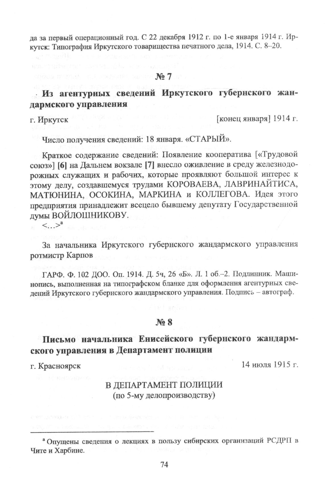 Из агентурных сведений Иркутского губернского жандармского управления. г. Иркутск. [Конец января] 1914 г. // ГАРФ. Ф. 102 ДОО. Оп. 1914. Д. 5ч, 26 «Б». Л. 1 об.-2. Подлинник.