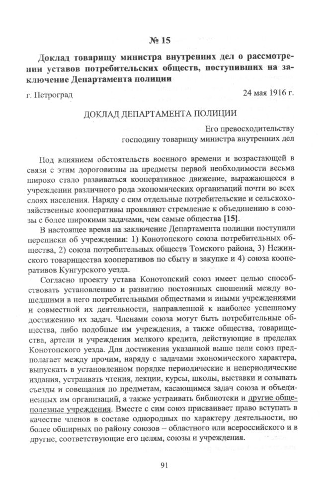 Доклад товарищу министра внутренних дел о рассмотрении уставов потребительских обществ, поступивших на заключение Департамента полиции. г. Петроград. 24 мая 1916 г. // ГАРФ. Ф. 102 4Д. Оп. 1916. Д. 124. Л. 74-77 об. Подлинник. Машинопись, выполненная на бланке Департамента полиции. Подпись - автограф.