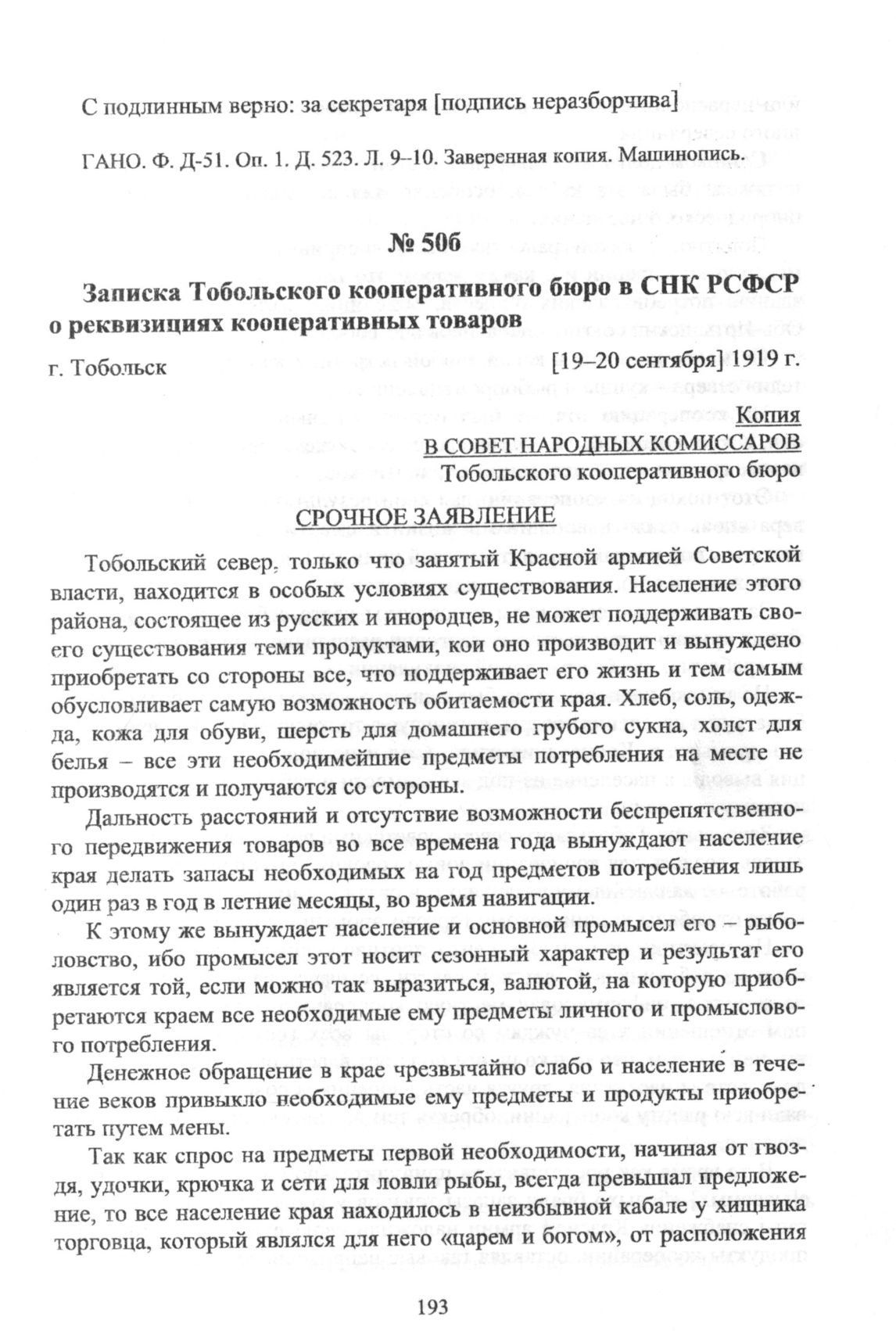 Записка Тобольского кооперативного бюро в СНК РСФСР о реквизициях кооперативных товаров. г. Тобольск. [19-20 сентября] 1919 г. // ГАНО. Ф. Д-51. Oп. 1. Д. 523. Л. 2 -3 об. Заверенная копия. Машинопись.