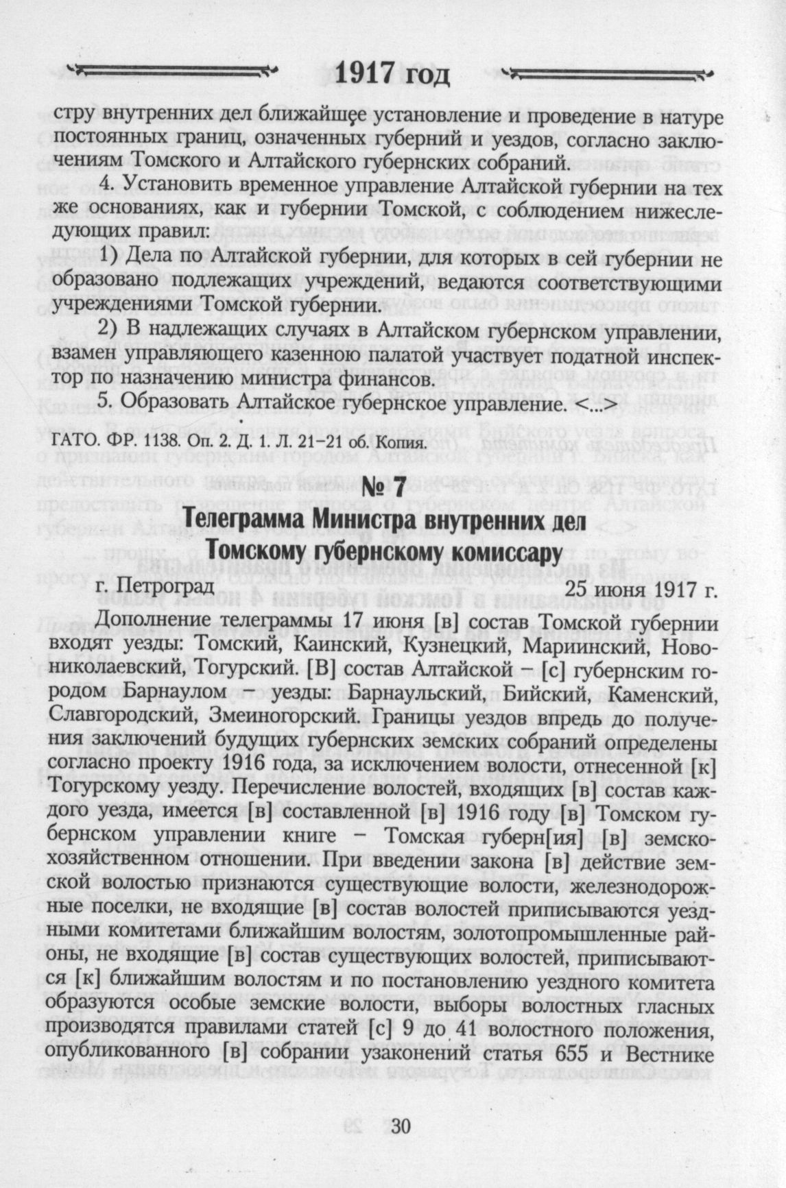Телеграмма Министра внутренних дел Томскому губернскому комиссару. г. Петроград. 25 июня 1917 г. // ГАТО. ФР. 1138. Оп. 2. Д. 1. Л. 23-24. Копия.