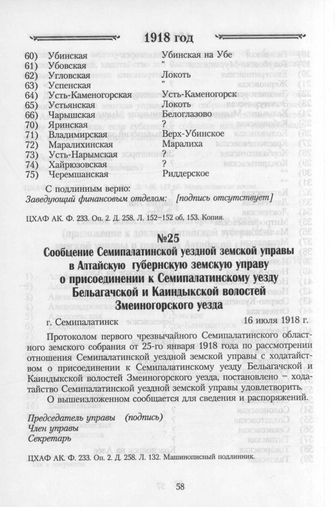 Сообщение Семипалатинской уездной земской управы в Алтайскую губернскую земскую управу о присоединении к Семипалатинскому уезду Бельагачской и Каиндыкской волостей Змеиногорского уезда. г. Семипалатинск. 16 июля 1918 г. // ЦХАФ АК. Ф. 233. Оп. 2. Д. 258. Л. 132. Машинописный подлинник.