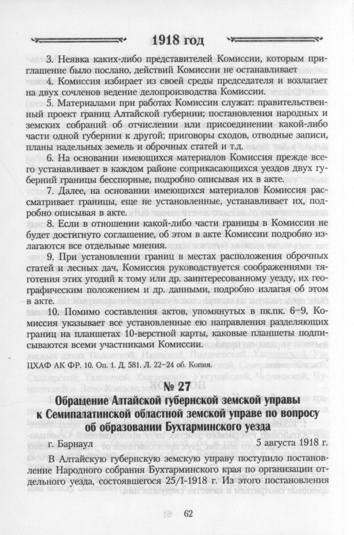 Обращение Алтайской губернской земской управы к Семипалатинской областной земской управе по вопросу об образовании Бухтарминского уезда. г. Барнаул. 5 августа 1918 г. // ЦХАФ АК. ФР. 10. Оп. 1. Д. 581. Л. 15 об.-16. Копия.