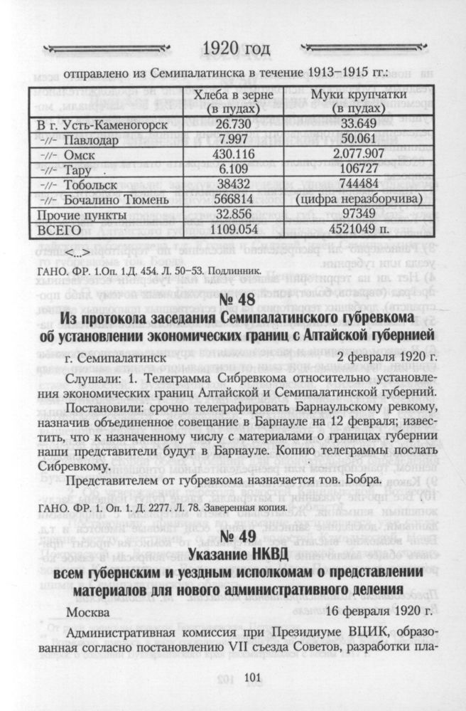 Из протокола заседания Семипалатинского губревкома об установлении экономических границ с Алтайской губернией. г. Семипалатинск. 2 февраля 1920 г. // ГАНО. ФР. 1. Oп. 1. Д. 2277. Л. 78. Заверенная копия.