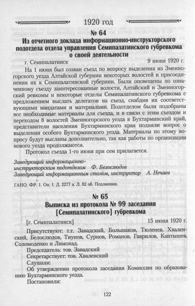 Выписка из протокола № 99 заседания [Семипалатинского] губревкома. [г. Семипалатинск].15 июня 1920 г. // ГАНО. ФР. 1. Oп. 1. Д. 83. Л. 13-13 об. Копия.