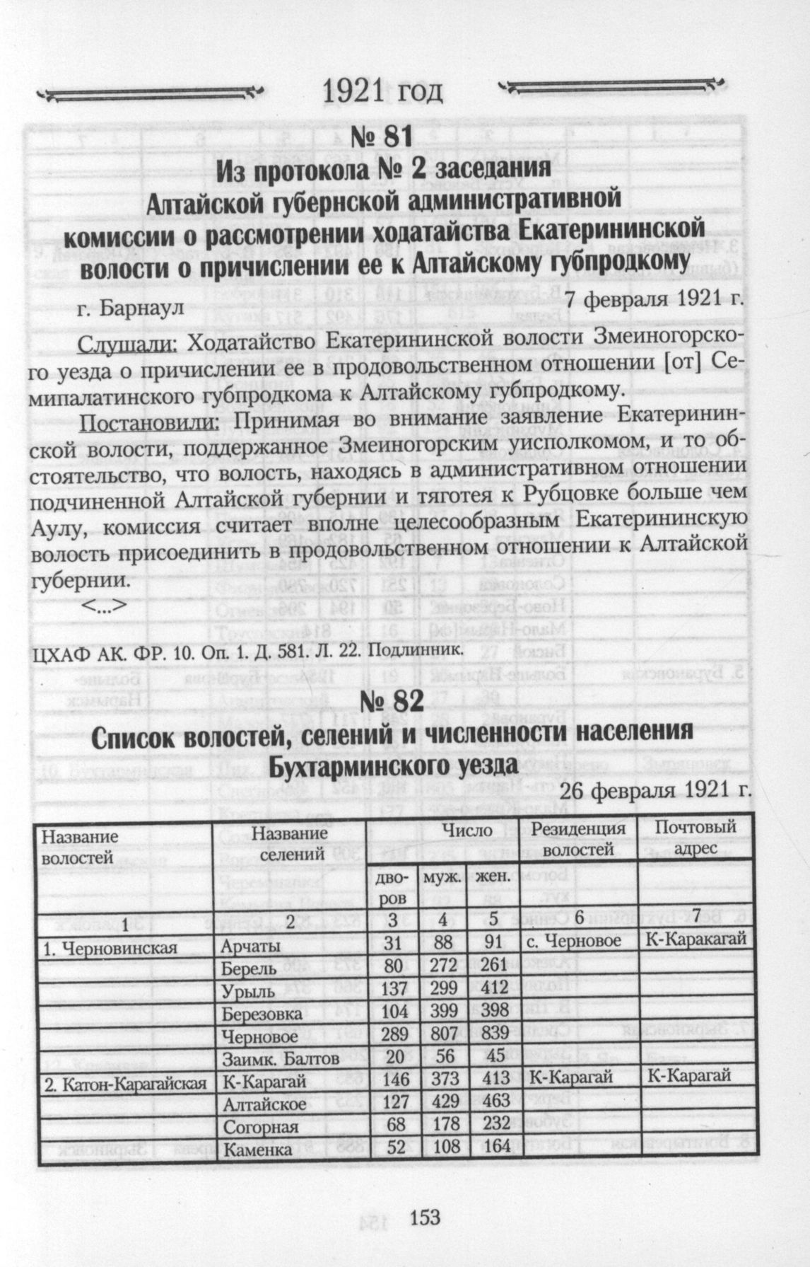 Из протокола № 2 заседания Алтайской губернской административной комиссии о рассмотрении ходатайства Екатерининской волости о причислении ее к Алтайскому губпродкому. г. Барнаул. 7 февраля 1921 г. // ЦХАФ АК. ФР. 10. Oп. 1. Д. 581. Л. 22. Подлинник.