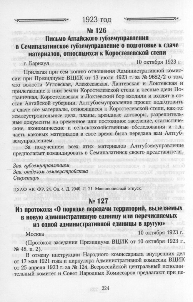 Из протокола «О порядке передачи территорий, выделяемых в новую административную единицу или перечисляемых из одной административной единицы в другую». Москва. 10 октября 1923 г. // Постановления и распоряжения ВЦИК X созыва и его Президиума. М, 1923. № 10-11. Октябрь-ноябрь. С. 6-7.