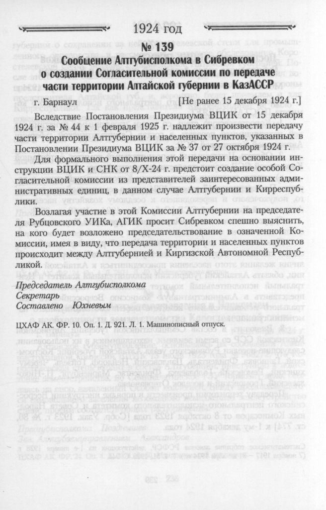 Сообщение Алтгубисполкома в Сибревком о создании Согласительной комиссии по передаче части территории Алтайской губернии в КазАССР. г. Барнаул. [Не ранее 15 декабря 1924 г.]