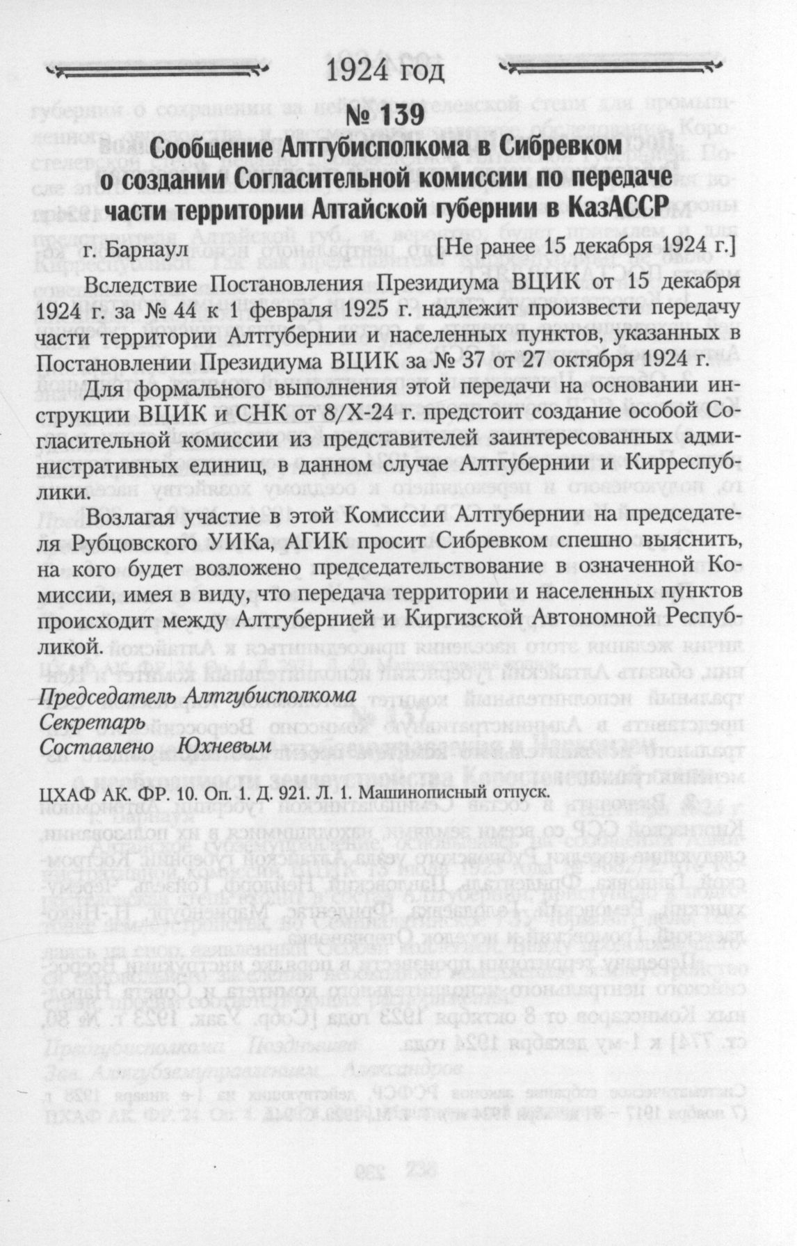 Сообщение Алтгубисполкома в Сибревком о создании Согласительной комиссии по передаче части территории Алтайской губернии в КазАССР. г. Барнаул. [Не ранее 15 декабря 1924 г.] // ЦХАФ АК. ФР. 10. Oп. 1. Д. 921. Л. 1. Машинописный отпуск.