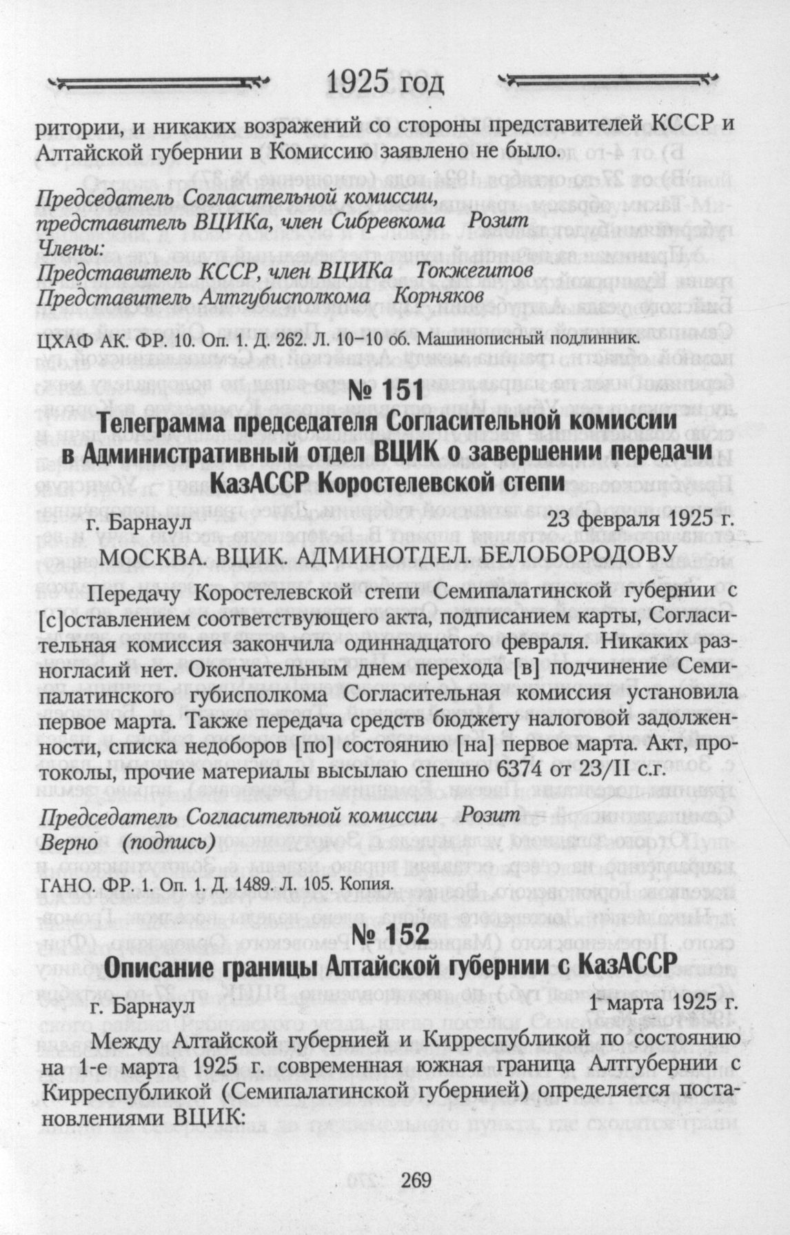 Описание границы Алтайской губернии с КазАССР. г. Барнаул.1 марта 1925 г. // ЦХАФ АК. ФР. 10. Oп.1. Д. 921. Л. 294-295. Копия.