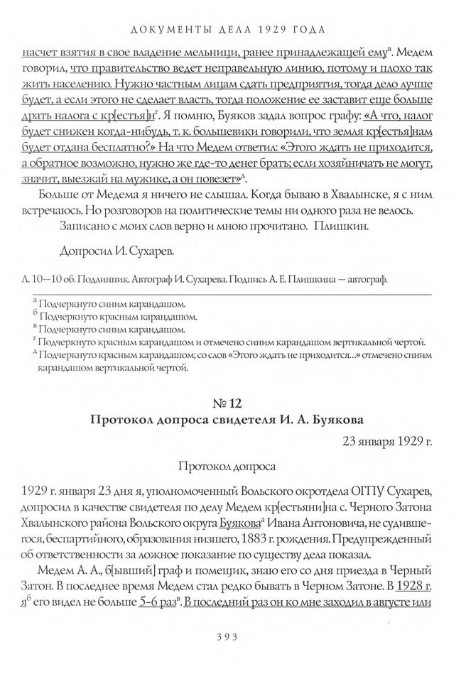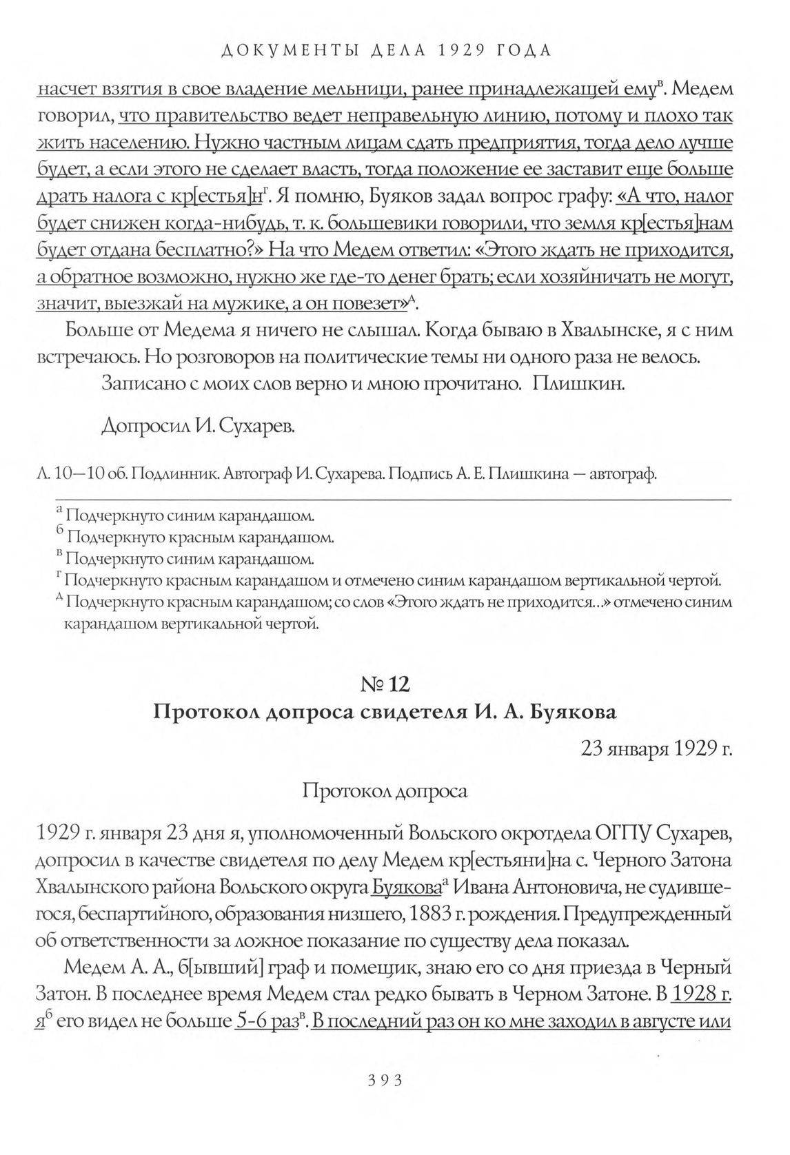 Протокол допроса свидетеля И. А. Буякова. 23 января 1929 г. // УФСБ России по Саратовской области. ОФ-14559. Л. 14—14 об. Подлинник. Автограф И. Сухарева. Подпись И. А. Буякова — автограф.