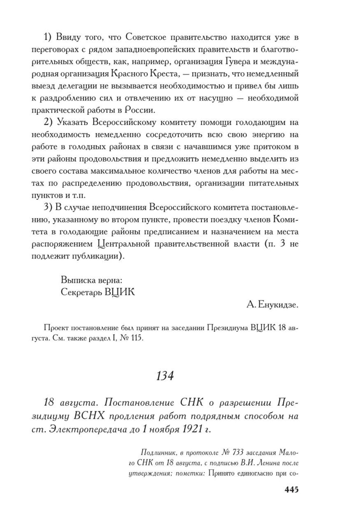 Постановление СНК о разрешении Президиуму ВСНХ продления работ подрядным способом на ст. Электропередача до 1 ноября 1921 г. 18 августа // Подлинник, в протоколе № 733 заседания Малого СНК от 18 августа, с подписью В.И. Ленина после утверждения; пометки: Принято единогласно при согласии докладчика || Председатель Г. Леплевский. Члены: Я. Гиндин. Н. Волынский. Черлюнчакевич. РГАСПИ, ф. 2, оп. 1, ед. хр. 20381, л. 11. Печатается впервые.