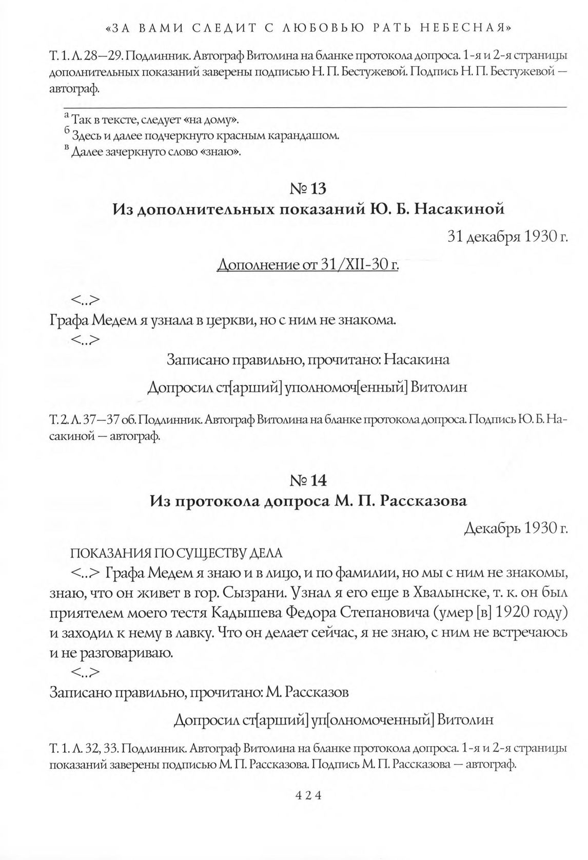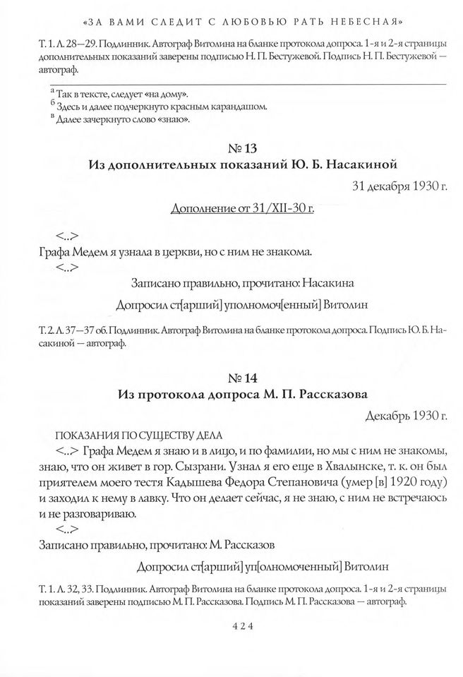 Из дополнительных показаний Ю. Б. Насакиной. 31 декабря 1930 г. // УФСБ России по Самарской области. П-14633. Т. 2. Л. 37—37 об. Подлинник. Автограф Витолина на бланке протокола допроса. Подпись Ю. Б. Насакиной — автограф.