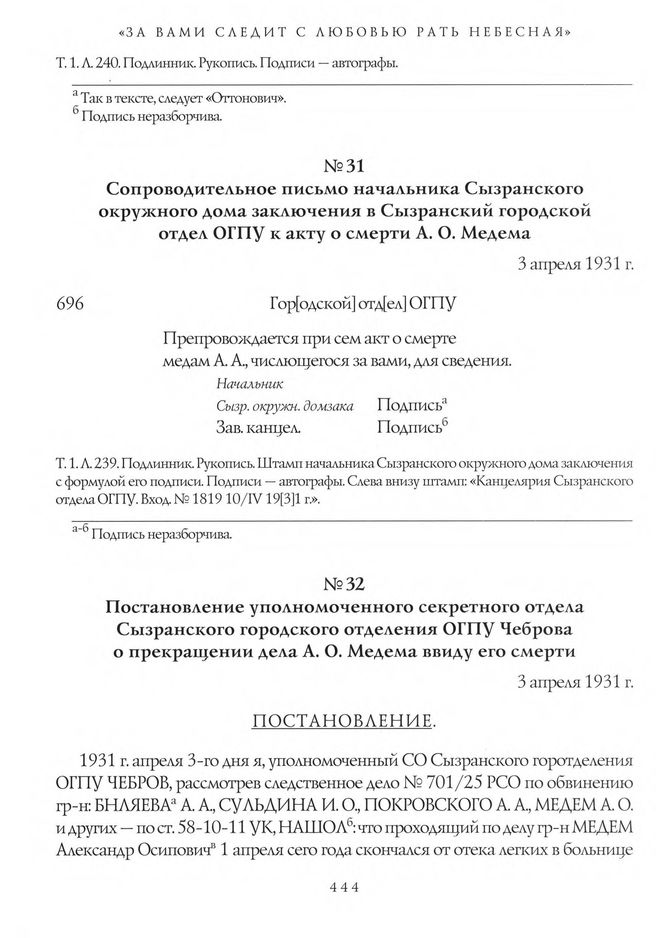 Сопроводительное письмо начальника Сызранского окружного дома заключения в Сызранский городской отдел ОГПУ к акту о смерти А. О. Медема. 3 апреля 1931 г. // УФСБ России по Самарской области. П-14633. Т. 1. Л. 239. Подлинник. Рукопись. Штамп начальника Сызранского окрркного дома заключения с формулой его подписи. Подписи — автографы. Слева внизу штамп: «Канцелярия Сызранского отдела ОГПУ. Вход.№ 1819 10/IV 19[3]1 г.».