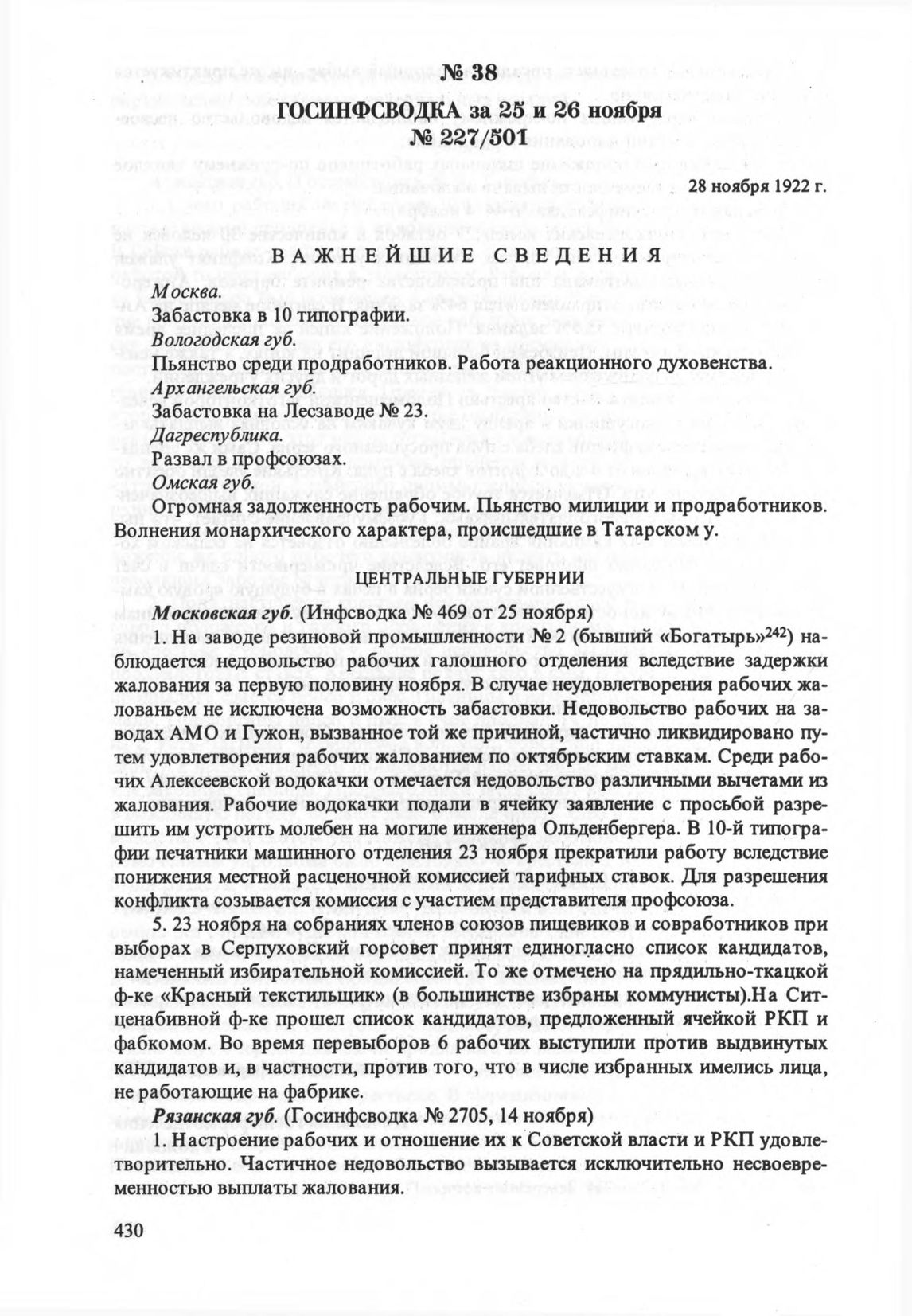 Госинфсводка за 25 и 26 ноября № 227/501. 28 ноября 1922 г. // ЦА ФСБ РФ. Ф. 1. Оп. 6. Д. 484. Л. 216-224. Заверенная копия.