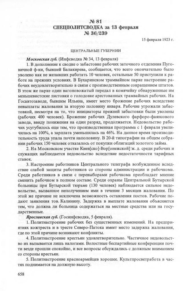 Спецполитсводка за 13 февраля № 36/239. 15 февраля 1923 г.
