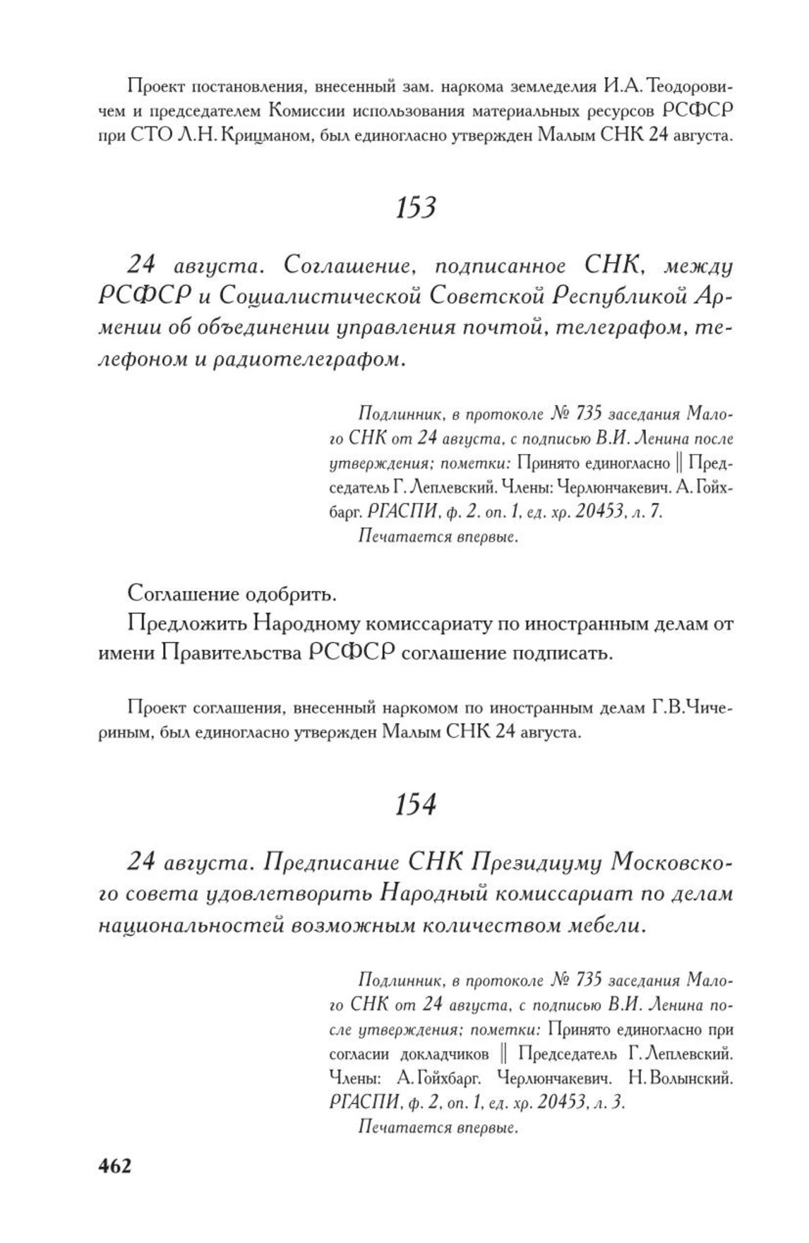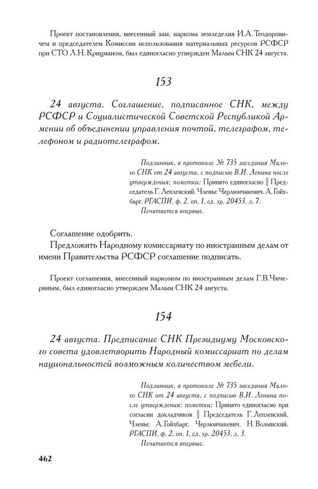 Соглашение, подписанное СНК, между РСФСР и Социалистической Советской Республикой Армении об объединении управления почтой, телеграфом, телефоном и радиотелеграфом. 24 августа // Подлинник, в протоколе № 735 заседания Малого СНК от 24 августа, с подписью В.И. Ленина после утверждения; пометки: Принято единогласно || Председатель Г. Леплевский. Члены: Черлюнчакевич. А. Гойхбарг. РГАСПИ, ф. 2. оп. 1, ед. хр. 20453, л. 7. Печатается впервые.