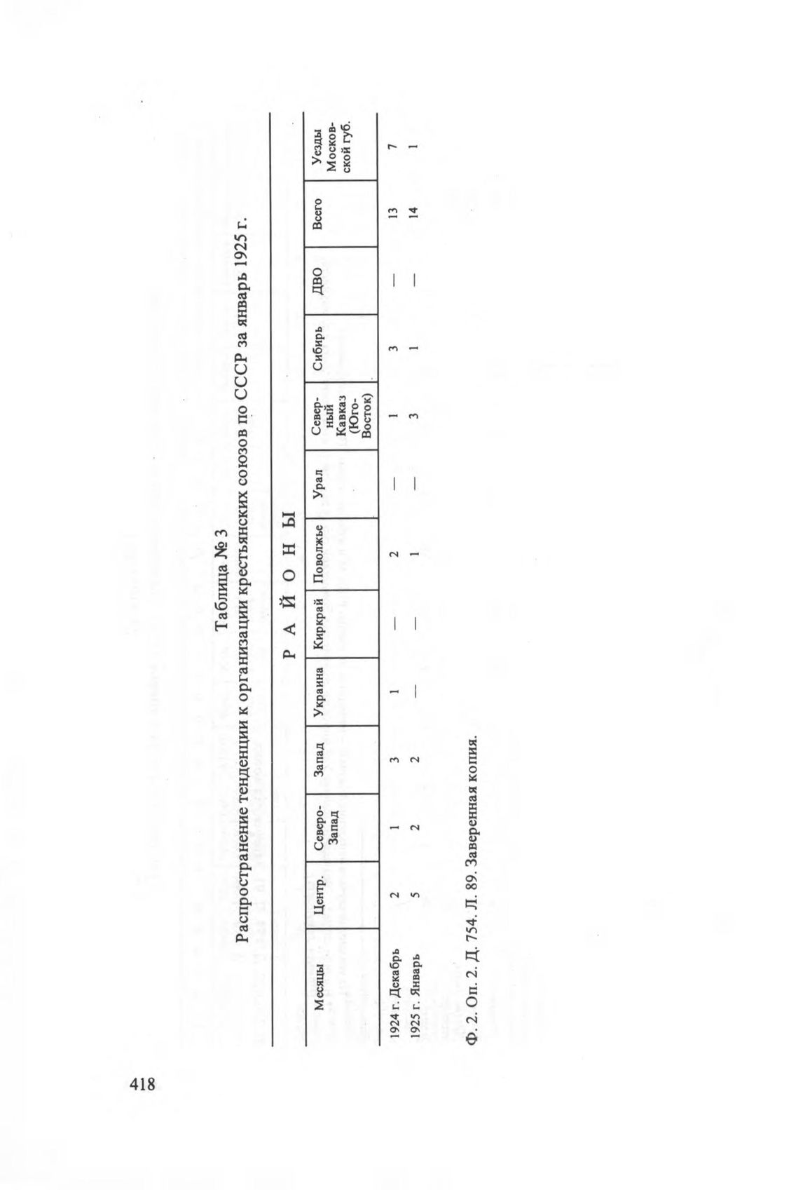 Таблица № 3. Распространение тенденций к организации крестьянских союзов по СССР за январь 1925 г. // ЦА ФСБ РФ. Ф. 2. Oп. 2. Д. 754. Л. 89. Заверенная копия.
