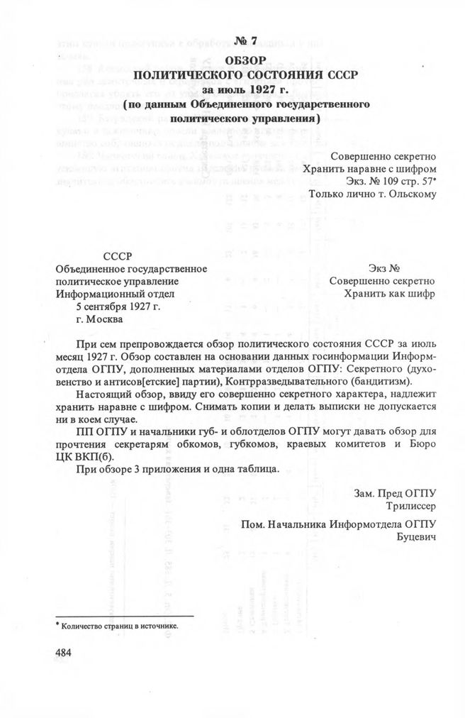 Обзор политического состояния СССР за июль 1927 г. (по данным Объединенного государственного политического управления) // ЦА ФСБ РФ. Ф. 2. Оп. 5. Д. 385. Л. 422-481. Заверенная копия.