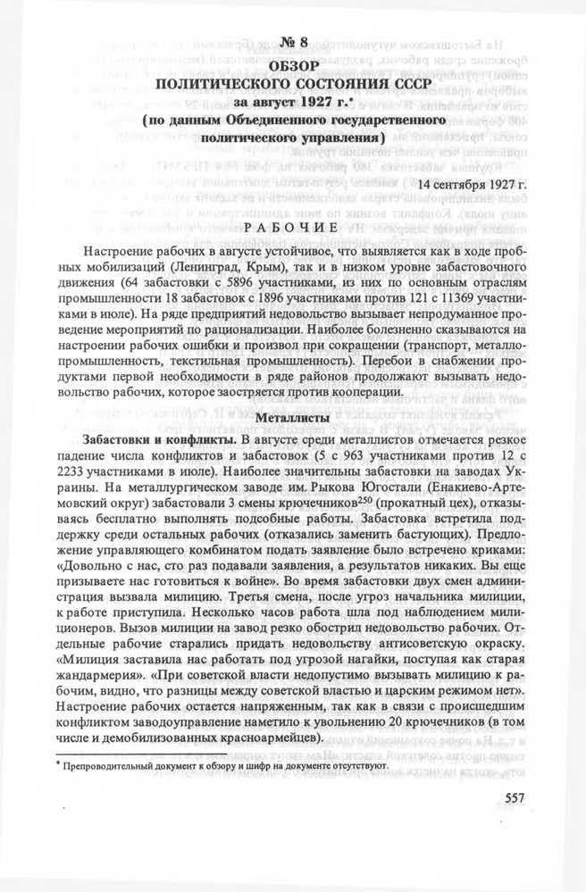 Обзор политического состояния СССР за август 1927 г. (по данным Объединенного государственного политического управления). 14 сентября 1927 г. // ЦА ФСБ РФ. Ф. 2. Оп. 5. Д. 386. Л. 45-84 об. Заверенная копия.