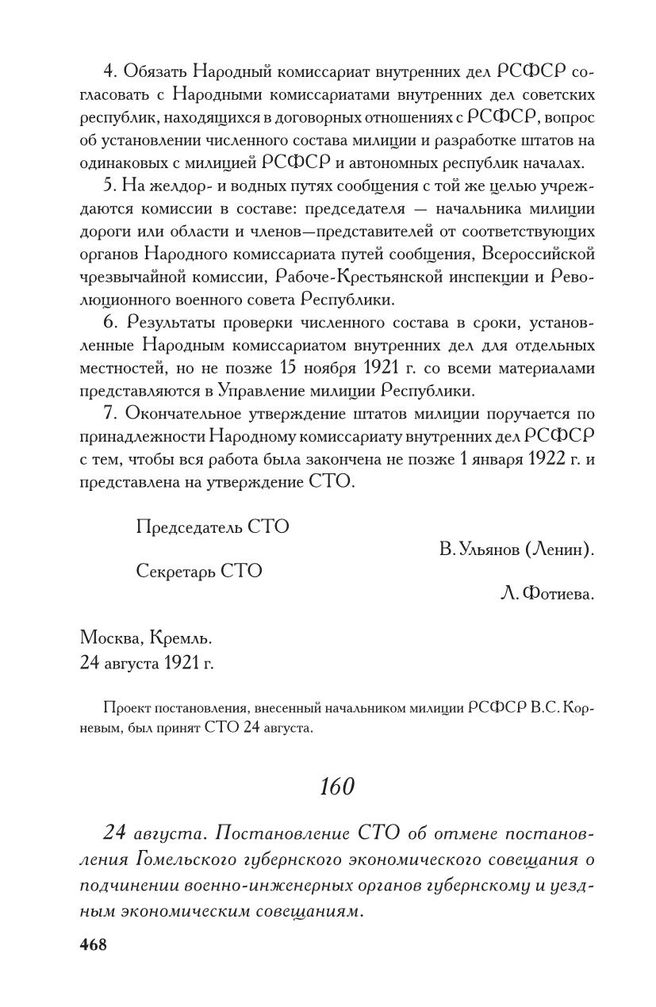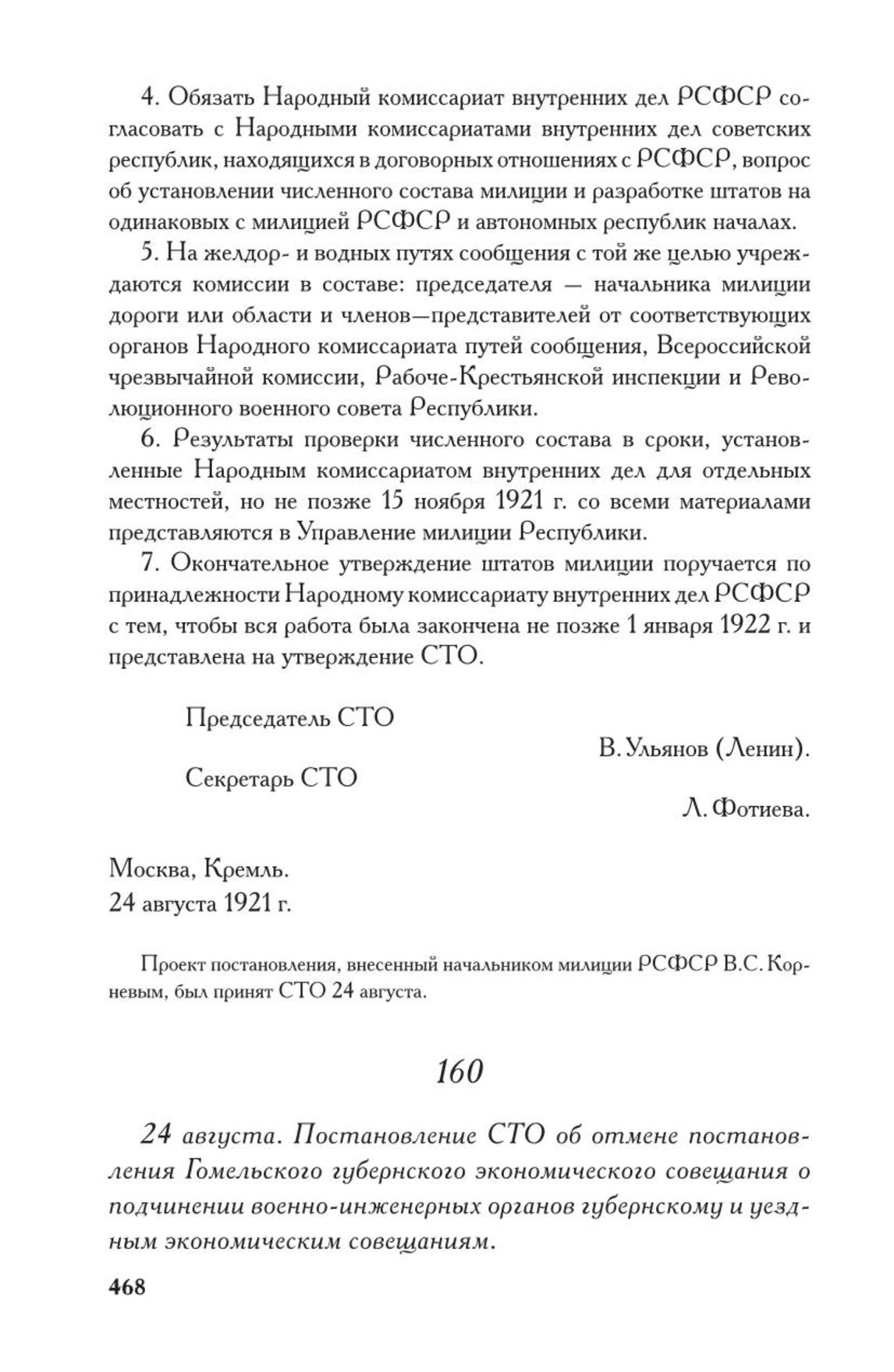 Постановление СТО об отмене постановления Гомельского губернского экономического совещания о подчинении военноинженерных дистанций губернскому и уездным экономическим совещаниям. 24 августа // Копия, в протоколе № 244 заседания СТО от 24 августа. РГАСПИ, ф. 19, оп. 3, ед. хр. 244, л. 3. Печатается впервые.