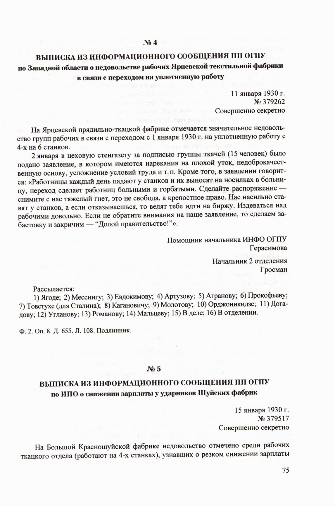 Выписка из информационного сообщения ПП ОГПУ по Западной области о недовольстве рабочих Ярцевской текстильной фабрики в связи с переходом на уплотненную работу. 11 января 1930 г. // ЦА ФСБ РФ. Ф. 2. Оп. 8. Д. 655. Л. 108. Подлинник.