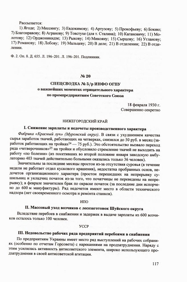 Спецсводка № 5/р ИНФО ОГПУ о важнейших моментах отрицательного характера по промпредприятиям Советского Союза. 18 февраля 1930 г.