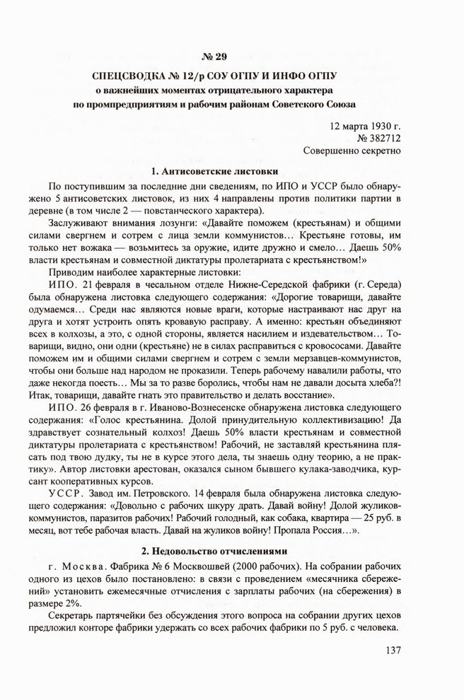 Спецсводка № 12/р СОУ ОГПУ и ИНФО ОГПУ о важнейших моментах отрицательного характера по промпредприятиям и рабочим районам Советского Союза. 12 марта 1930 г. // ЦА ФСБ РФ. Ф. 2. Оп. 8. Д. 655. Л. 238-245.
