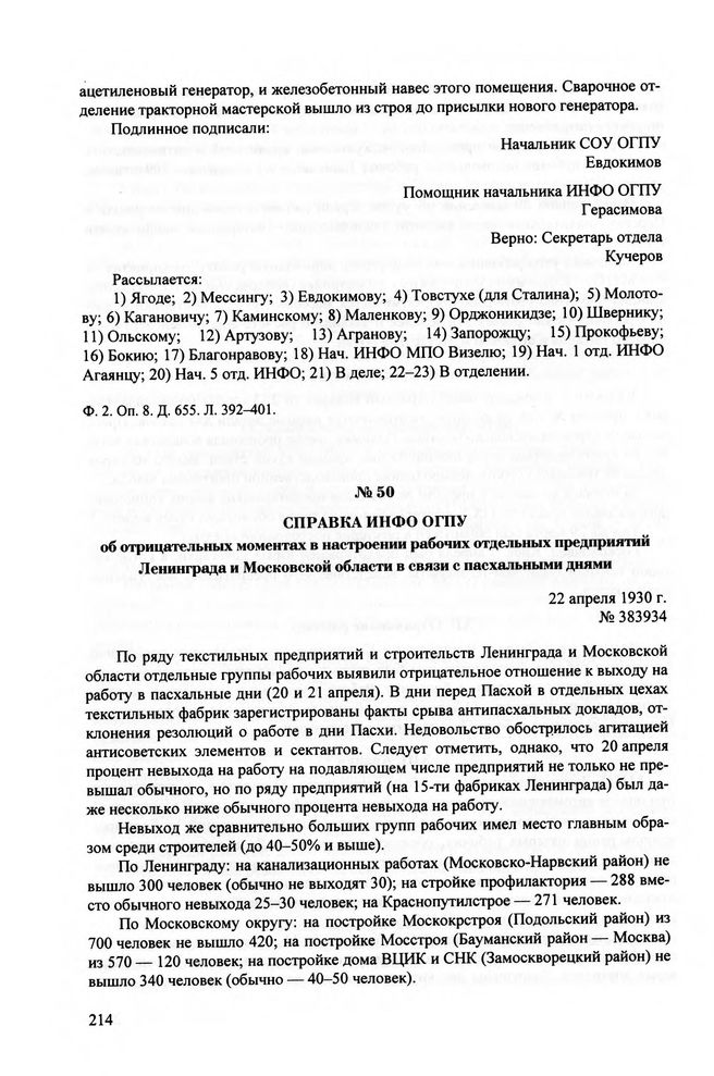 Справка ИНФО ОГПУ об отрицательных моментах в настроении рабочих отдельных предприятий Ленинграда и Московской области в связи с пасхальными днями. 22 апреля 1930 г. // ЦА ФСБ РФ. Ф. 2. Оп. 8. Д. 655. Л. 402-410. Подлинник.
