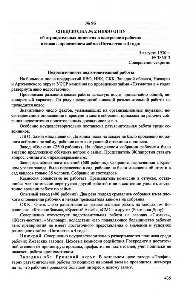 Спецсводка № 2 ИНФО ОГПУ об отрицательных моментах в настроении рабочих в связи с проведением займа «Пятилетка в 4 года». 5 августа 1930 г. // ЦА ФСБ РФ. Ф. 2. Оп. 8. Д. 655. Л. 815-821.