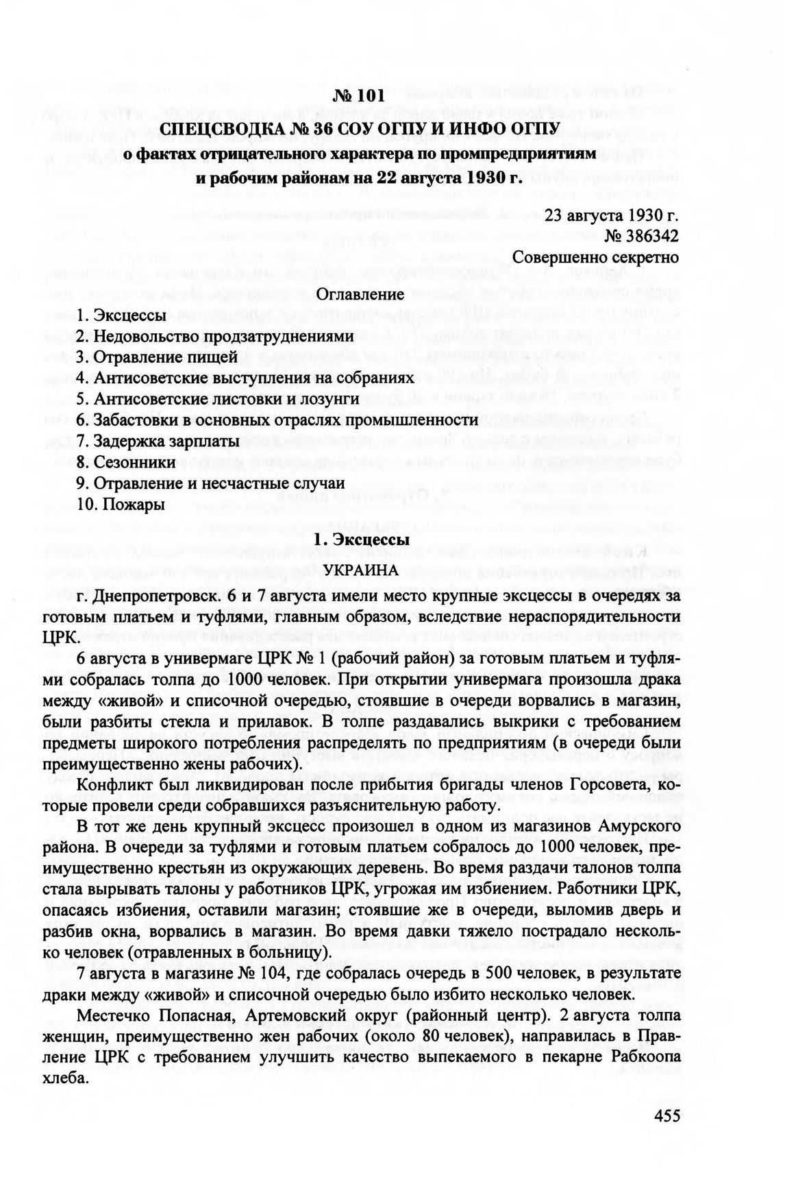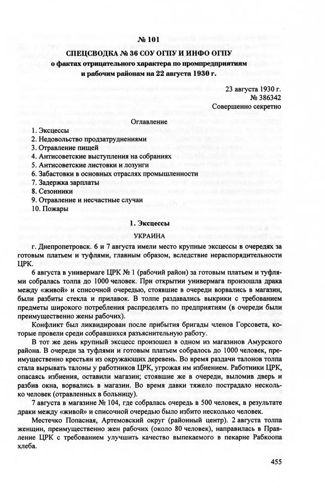 Спецсводка № 36 СОУ ОГПУ и ИНФО ОГПУ о фактах отрицательного характера по промпредприятиям и рабочим районам на 22 августа 1930 г. 23 августа 1930 г. // ЦА ФСБ РФ. Ф. 2. Оп. 8. Д. 655. Л. 857-867. Заверенная копия.